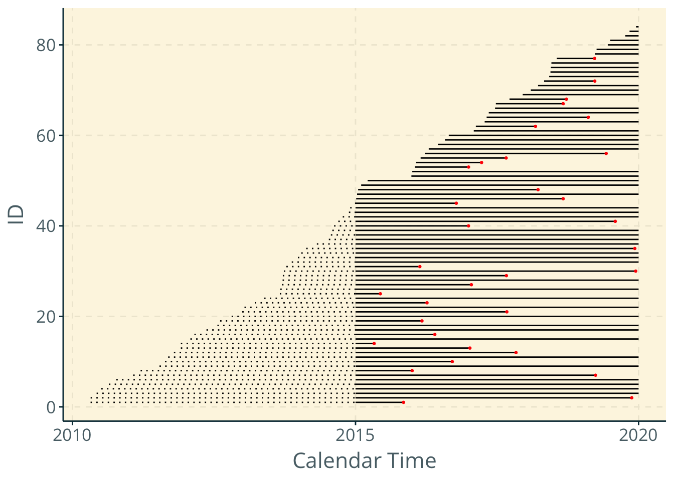 geom_point(data = dat %>% filter(y==1), aes(x = year0+t, y = id), color = "red", size = 0.6) +